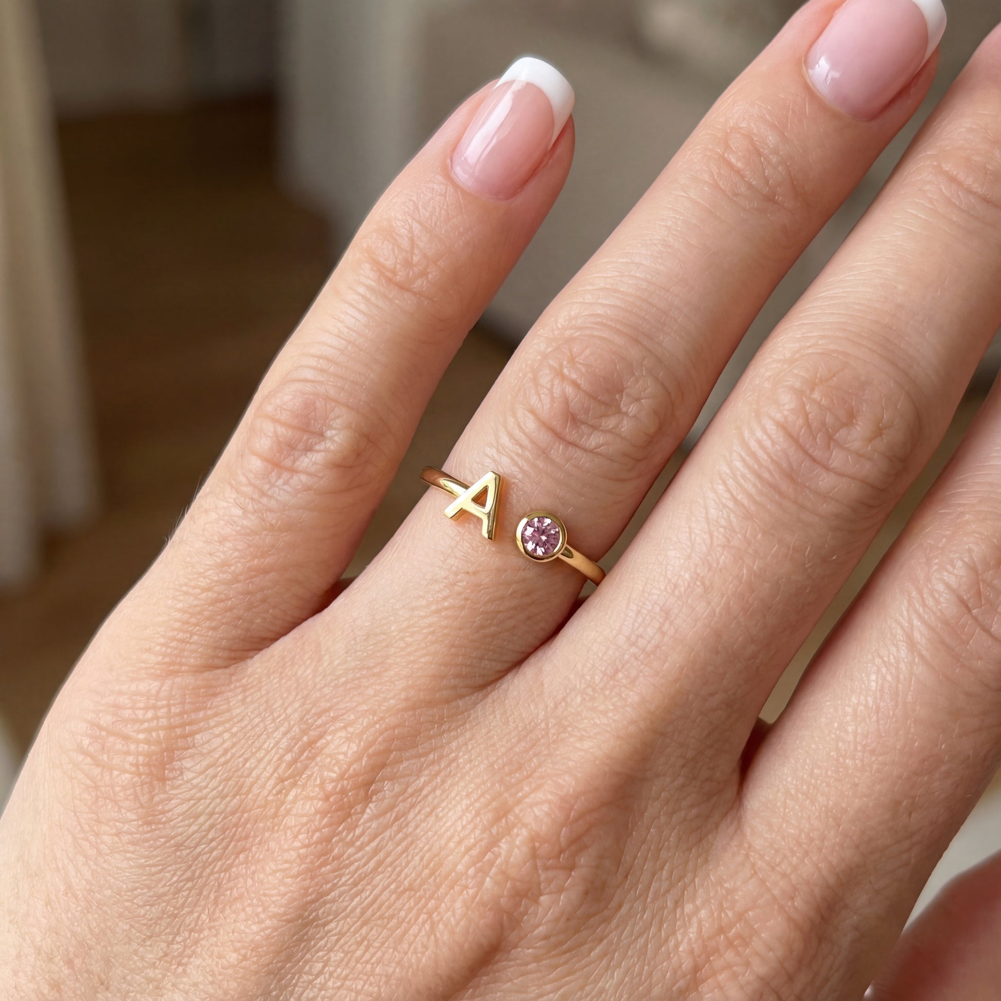 Un raffinato anello aperto con l'iniziale scelta in acciaio lucido, elegantemente valorizzato da una pietra di nascita. Il design minimalista avvolge con grazia il dito.