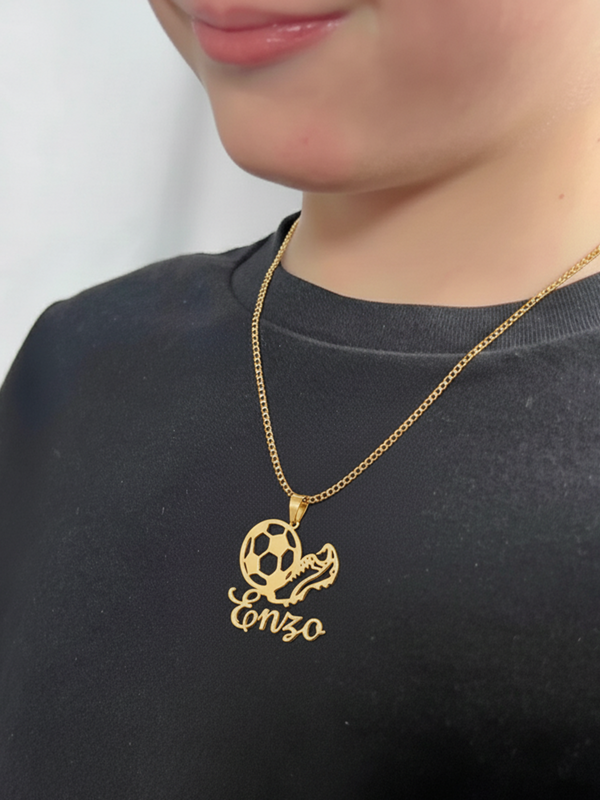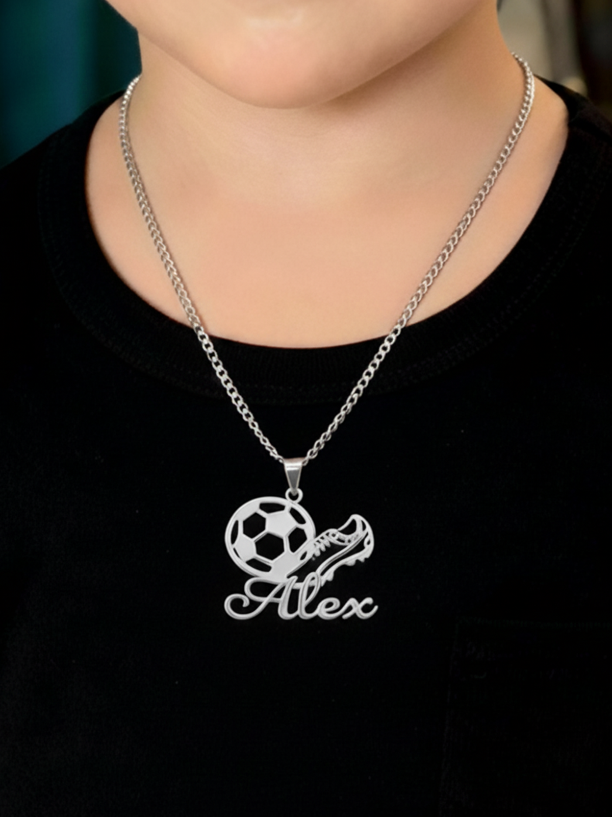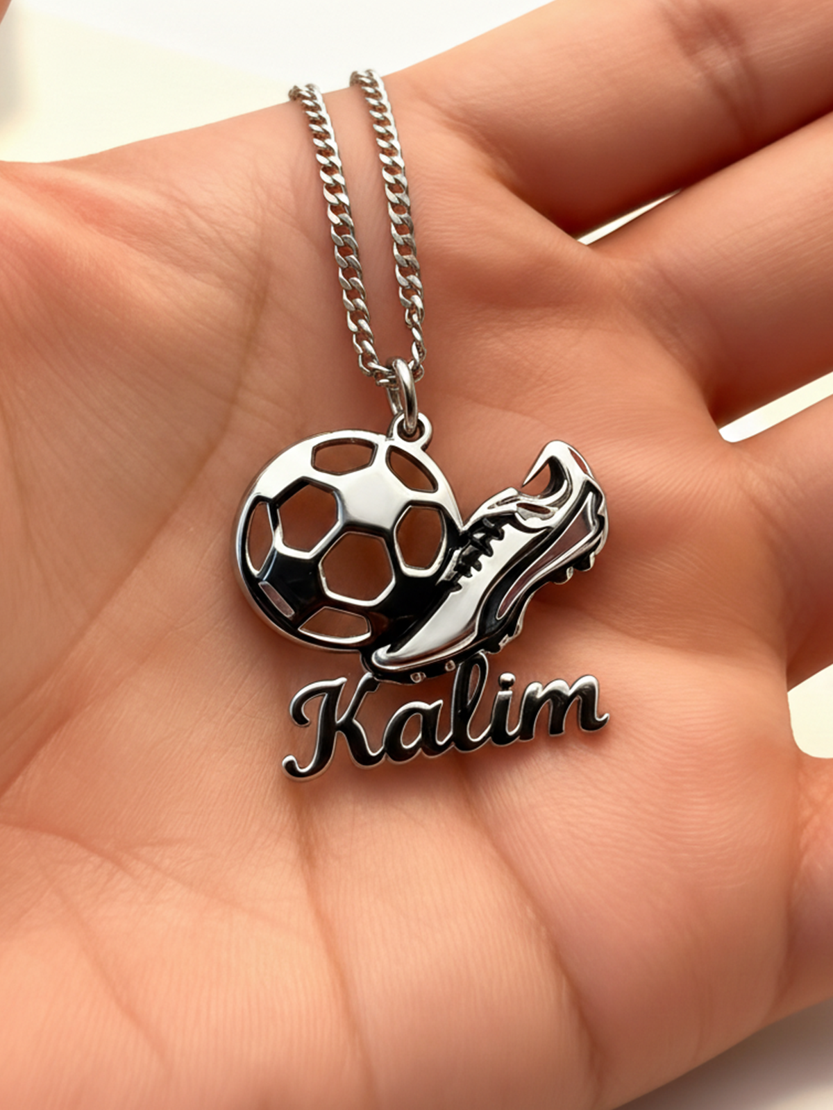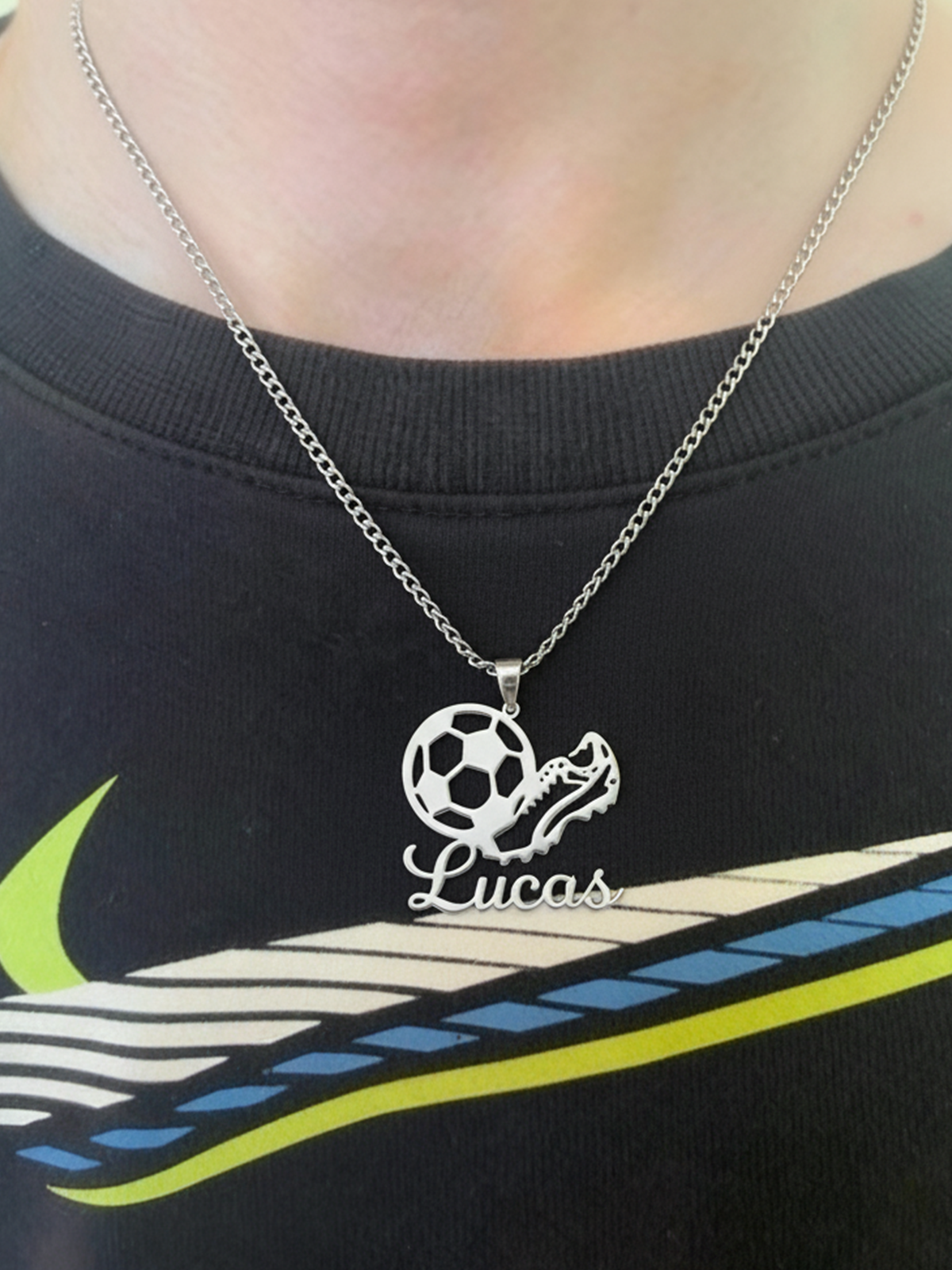 Per gli amanti del calcio di tutte le età. La nostra Collana Personalizzata con Nome da Calcio presenta un design dettagliato di pallone da calcio e scarpa da calcio con incisione del nome personalizzata.