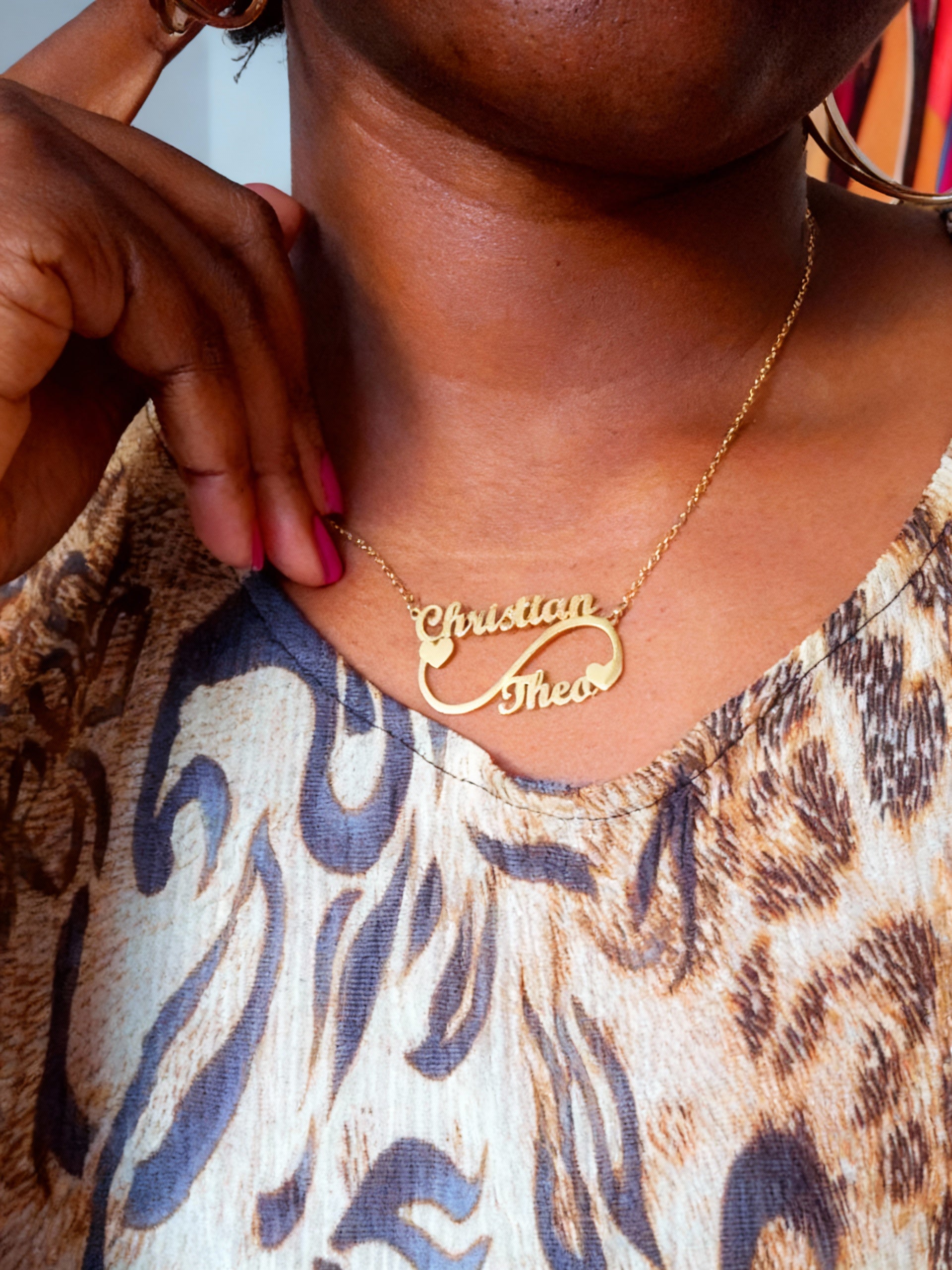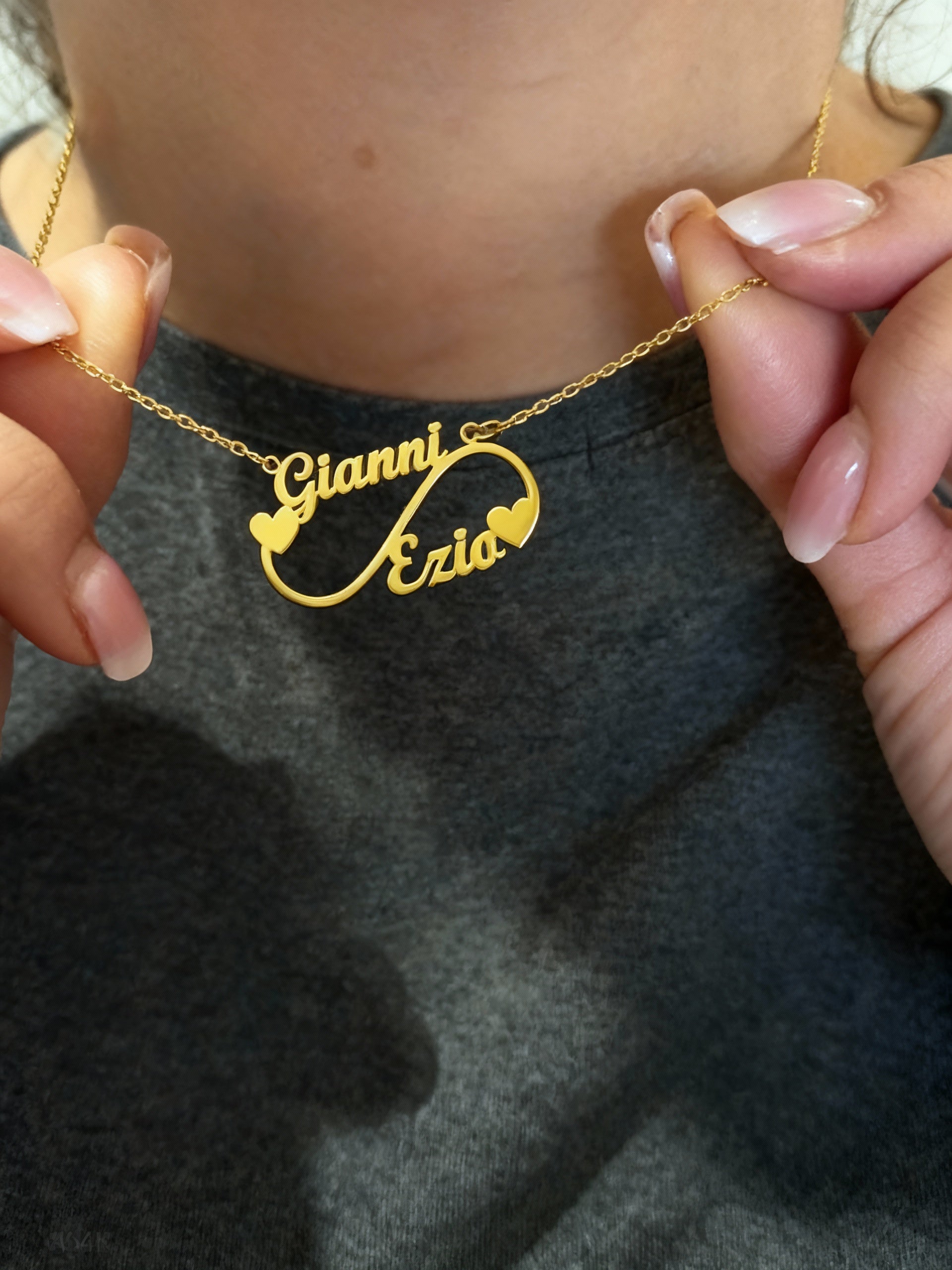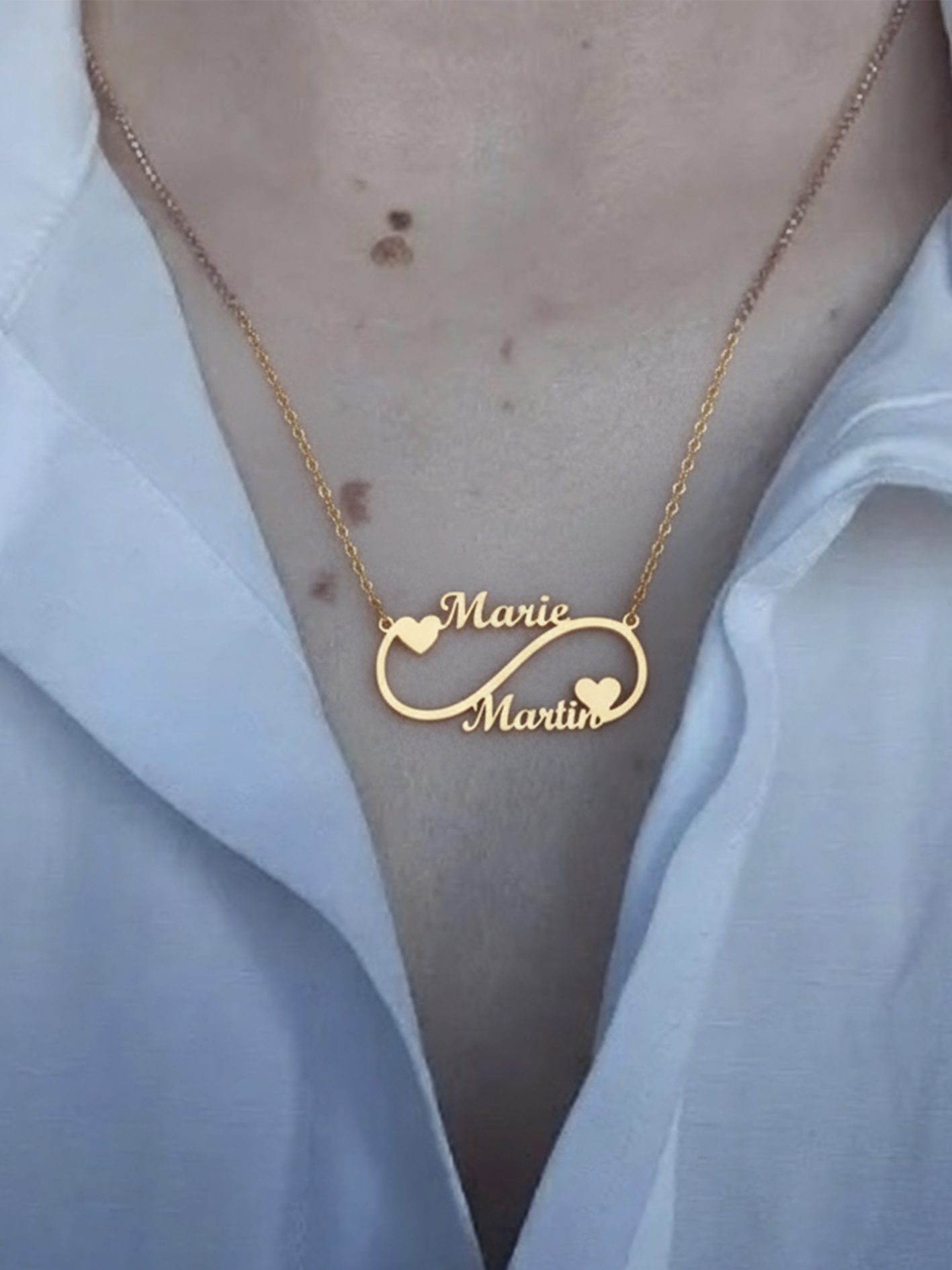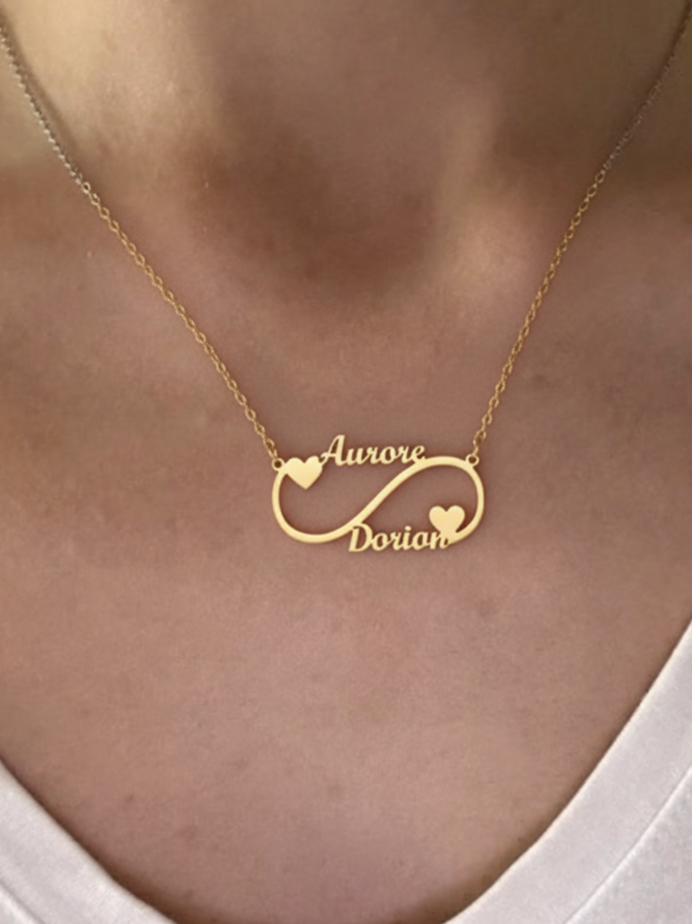 Regalare una collana personalizzata con il simbolo dell'infinito è molto più di un dono: è un simbolo di amore eterno. Immagina il loro volto illuminarsi quando scopriranno due nomi intrecciati per sempre all'interno del simbolo dell'infinito, adornato da delicati cuori. T