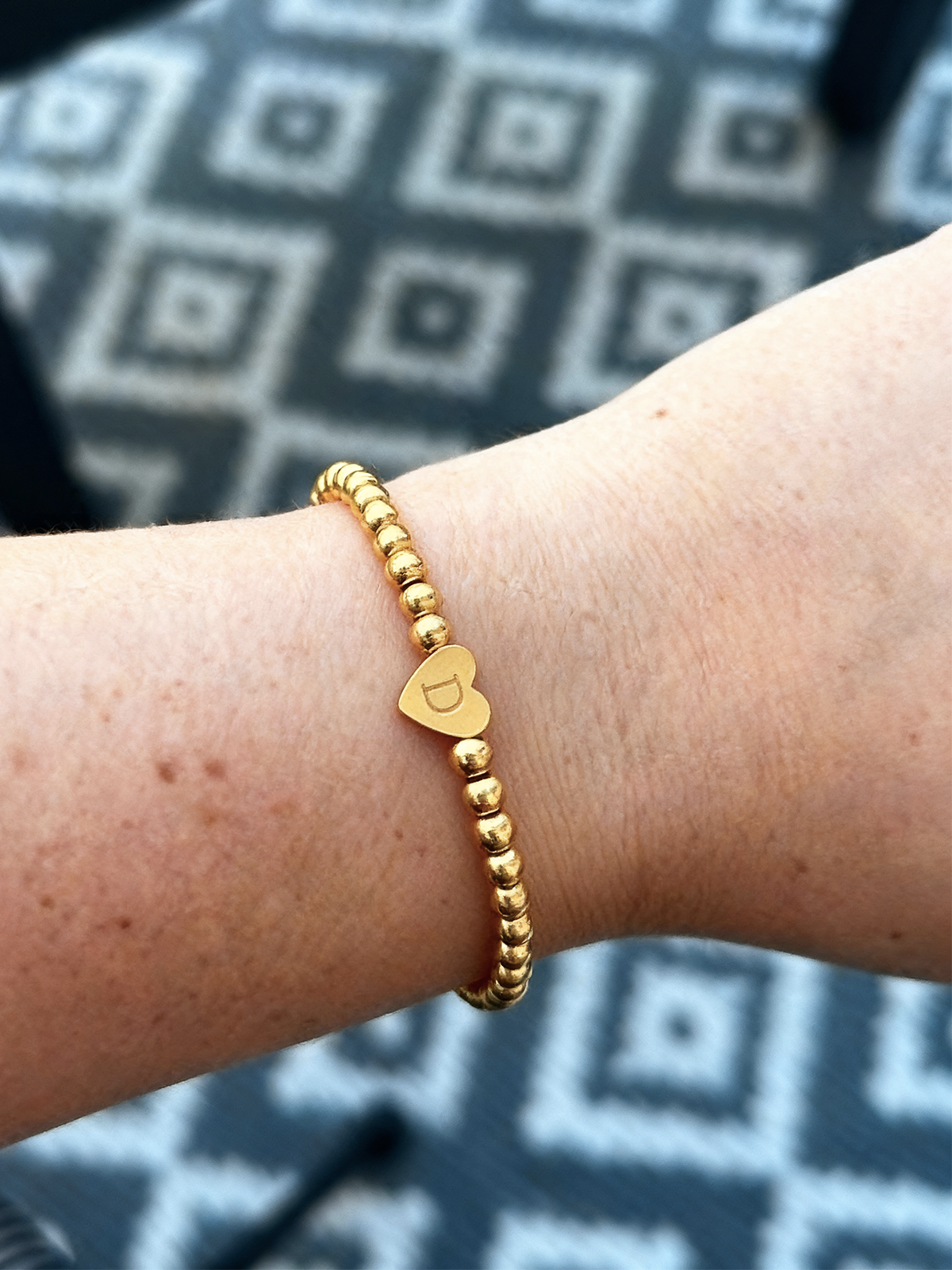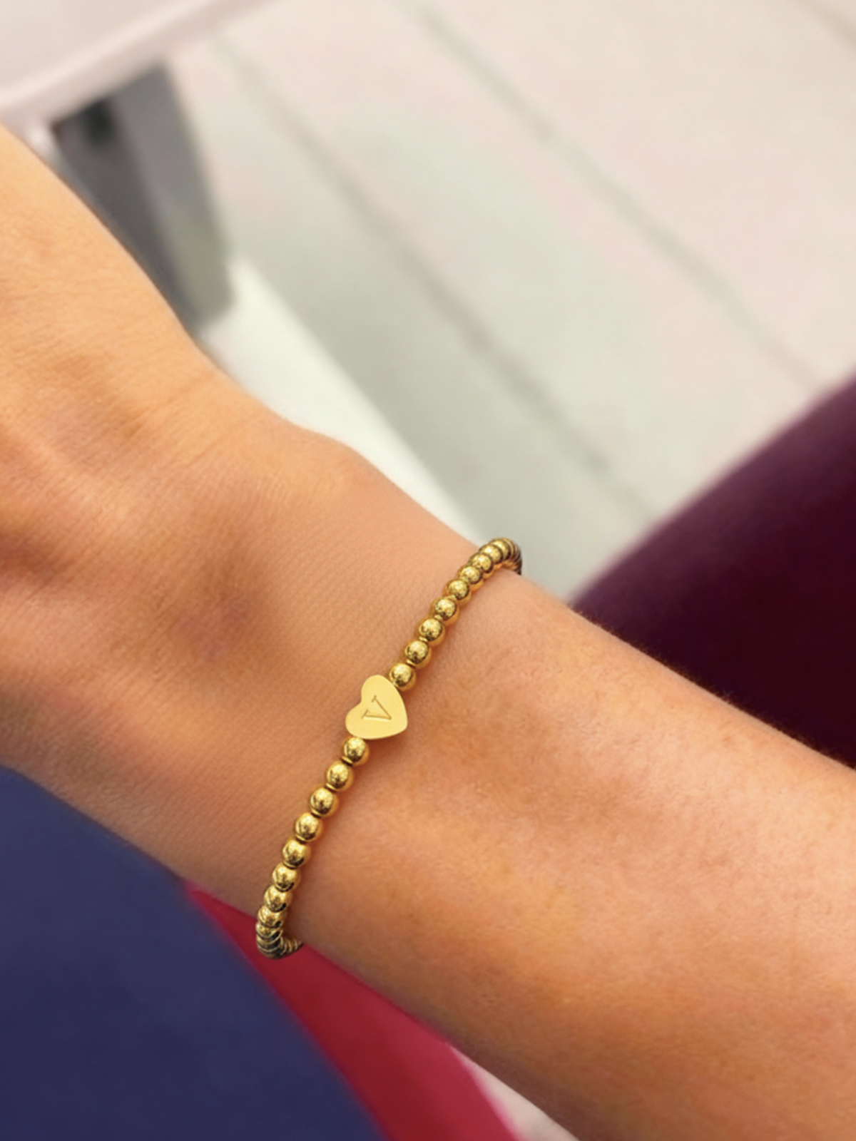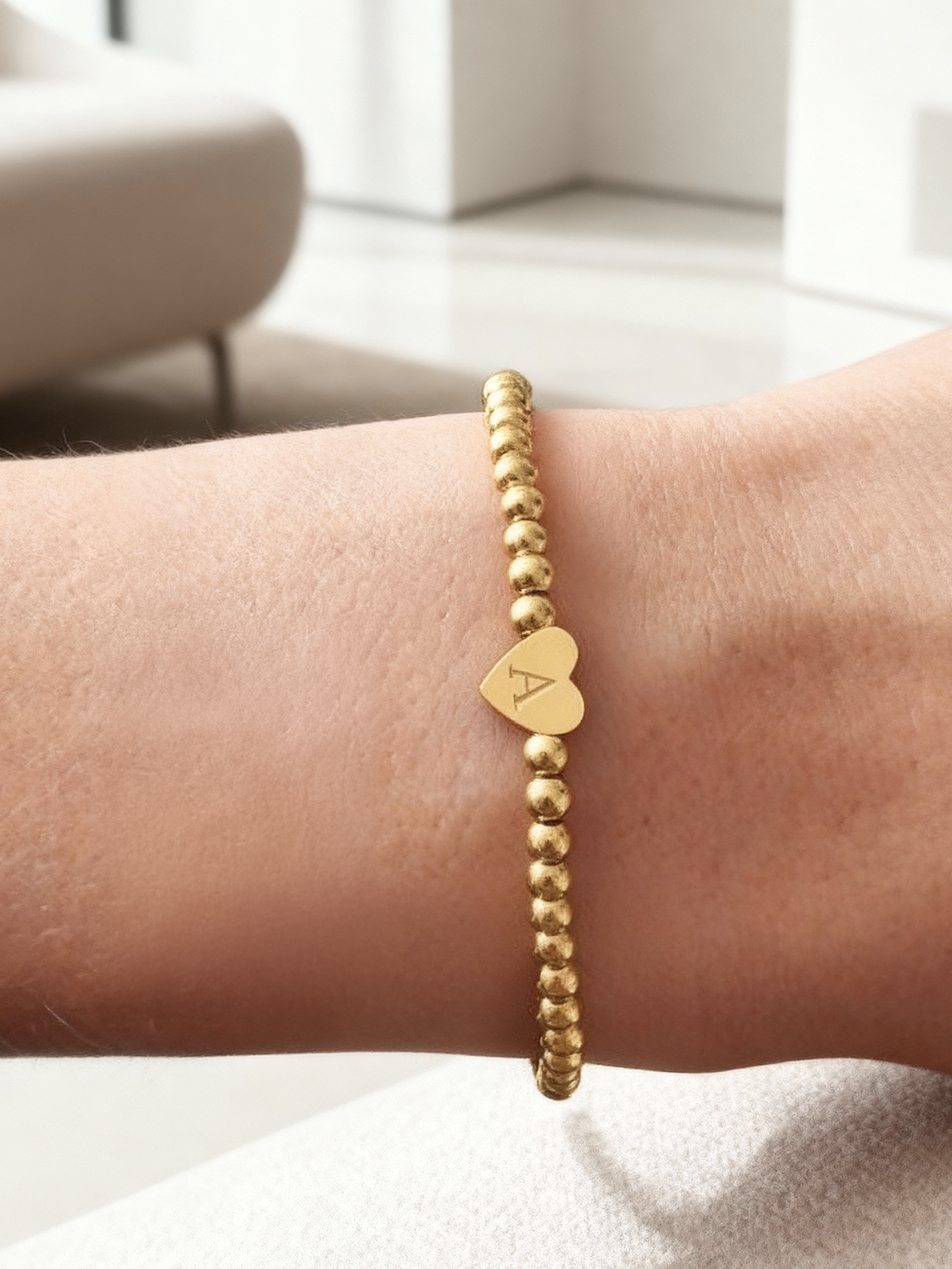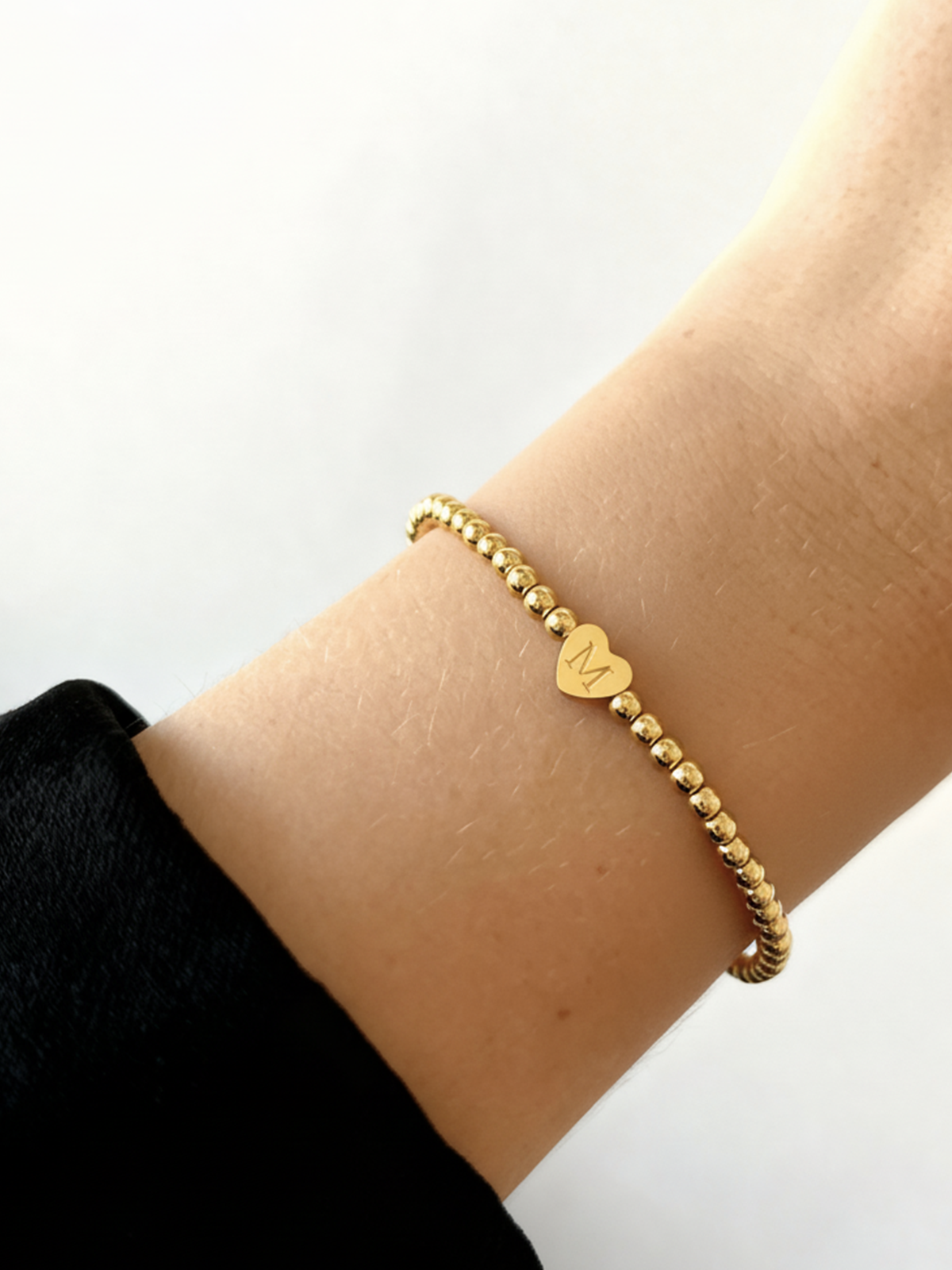 Questo raffinato bracciale, realizzato con perle color oro o argento, è impreziosito da un piccolo cuore centrale inciso con l'iniziale da te scelta. Simboleggiando amore, famiglia o amicizia, si adatta a tutti i polsi grazie al suo design elastico e confortevole. Sia come regalo che come coccola per te stesso, questo pezzo minimalista e chic incarna un legame unico.