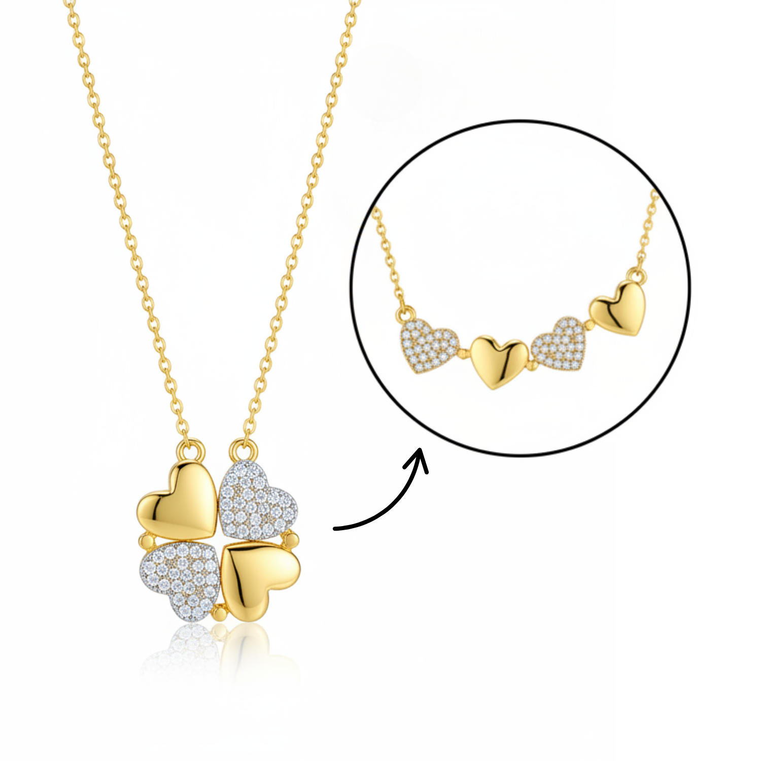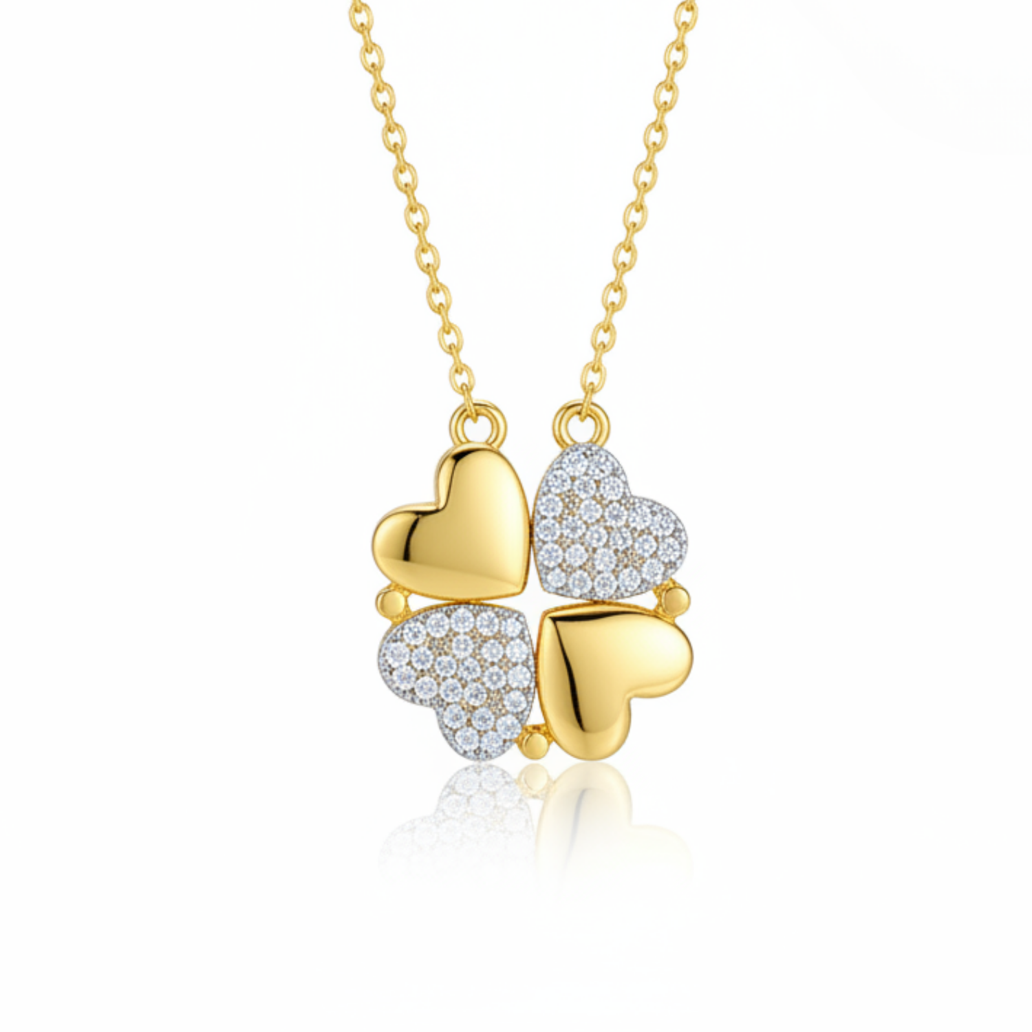 Questa collana presenta quattro cuori dorati, due scintillanti di cristalli, due delicatamente lucidati, che si uniscono per formare un delicato quadrifoglio. Un design intelligente che fonde romanticismo e buona fortuna, creato per accompagnare chi lo indossa con grazia e significato.