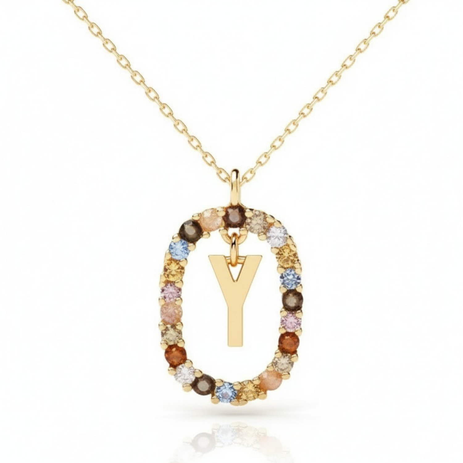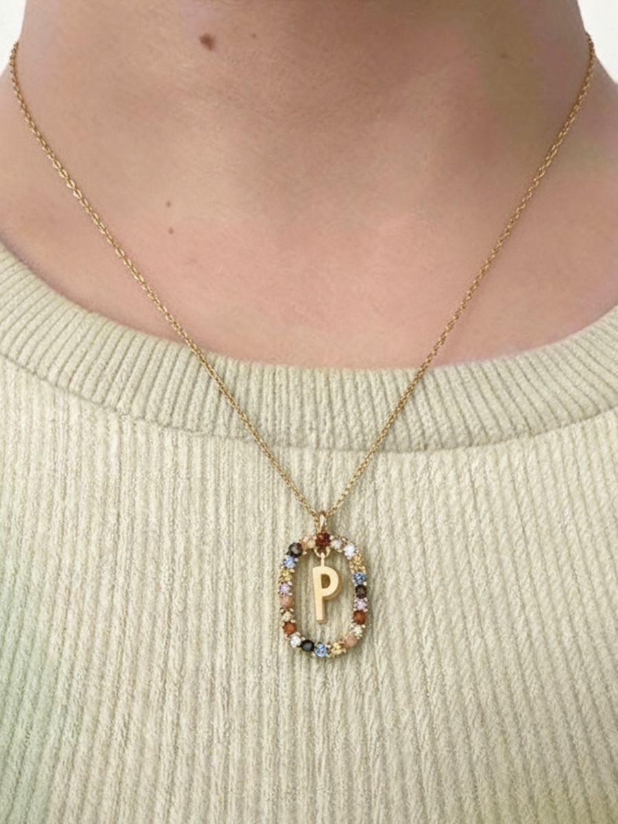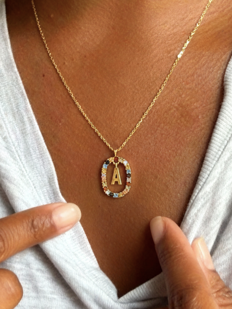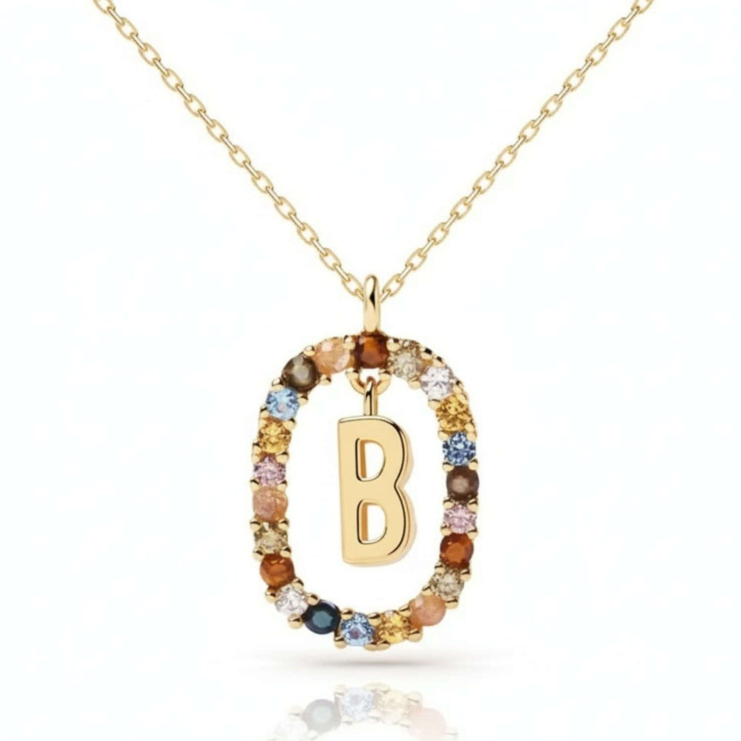 Aggiungi un tocco di colore ed eleganza al tuo stile con questa collana con iniziale delicatamente adornata da strass multicolore. Il suo ciondolo a forma di lettera dorata, sospeso al centro di un cerchio scintillante, cattura la luce da ogni angolazione per un effetto brillante garantito. Ogni strass è accuratamente selezionato per offrire una palette luminosa e gioiosa, rendendo ogni iniziale ancora più preziosa.