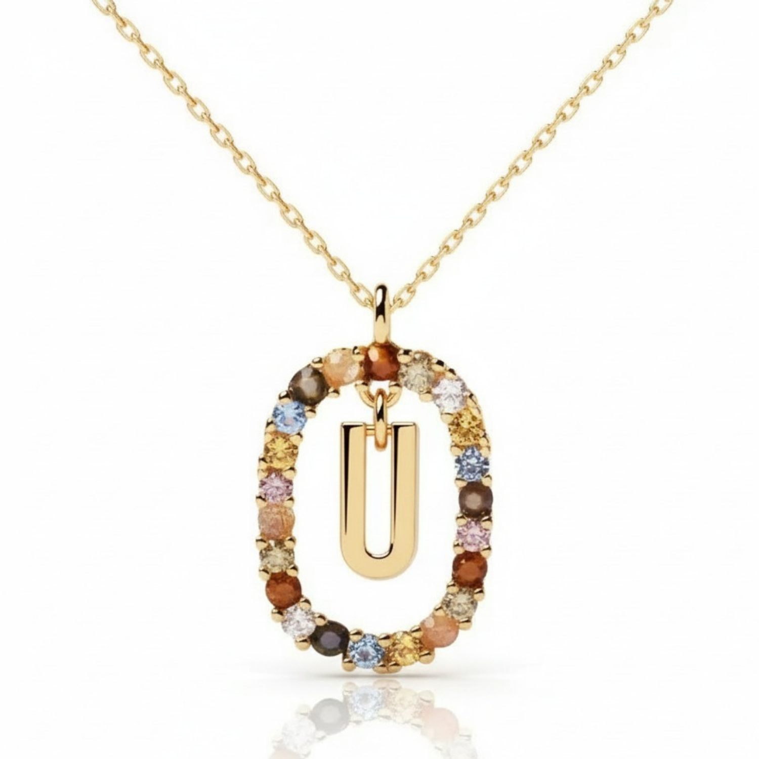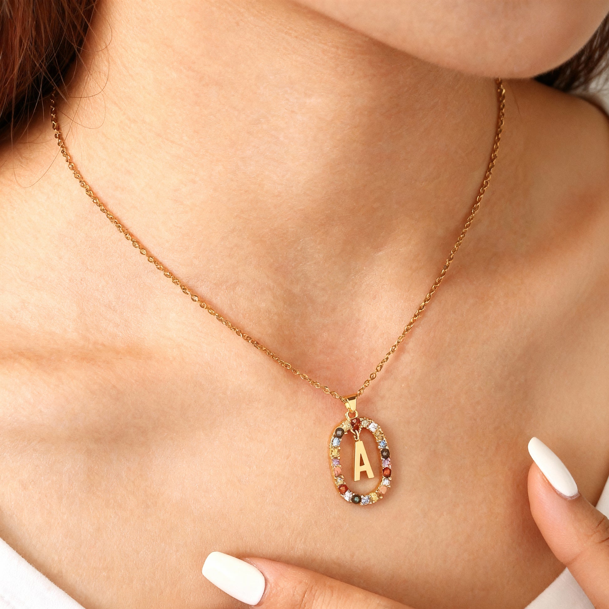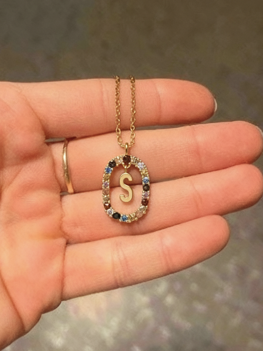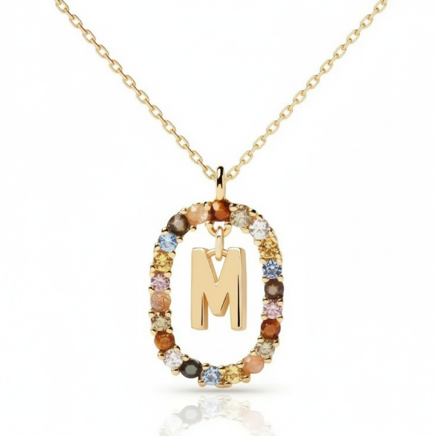 Aggiungi un tocco di colore ed eleganza al tuo stile con questa collana con iniziale delicatamente adornata da strass multicolore. Il suo ciondolo a forma di lettera dorata, sospeso al centro di un cerchio scintillante, cattura la luce da ogni angolazione per un effetto brillante garantito. Ogni strass è accuratamente selezionato per offrire una palette luminosa e gioiosa, rendendo ogni iniziale ancora più preziosa.